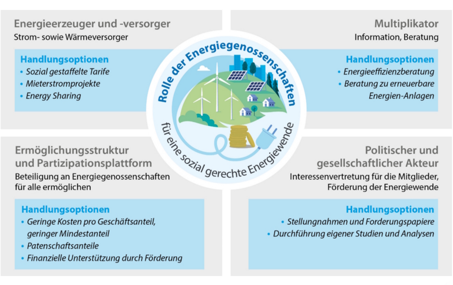 Neben der finanziellen Seite ist die gesellschaftliche Teilhabe entscheidend, die auf Information, Mitbestimmung und Empowerment beruht. Die breite Basis an rund 220.000 Mitgliedern verleiht den etwa 1.000 Energiegenossenschaften hier in Deutschland ein relevantes politisches Gewicht. Als gesellschaftspolitische Akteurinnen (siehe Abbildung 1) sind sie eine starke Stimme für eine bürgergetragene, dezentrale Energiewende. Gemeinsam mit ihren Verbänden, wie dem Deutschen Genossenschafts- und Raiffeisenverband e. V. und dem Bündnis Bürgerenergie e. V., versuchen Energiegenossenschaften durch Stellungnahmen zu Gesetzen, Positionspapiere und Kampagnen auf bessere Rahmenbedingungen hinzuwirken. Bislang lag der Fokus oft auf technischen und regulatorischen Fragen, doch zunehmend bringen sie – auch über ihre Verbände – soziale Aspekte in den energiepolitischen Diskurs ein.