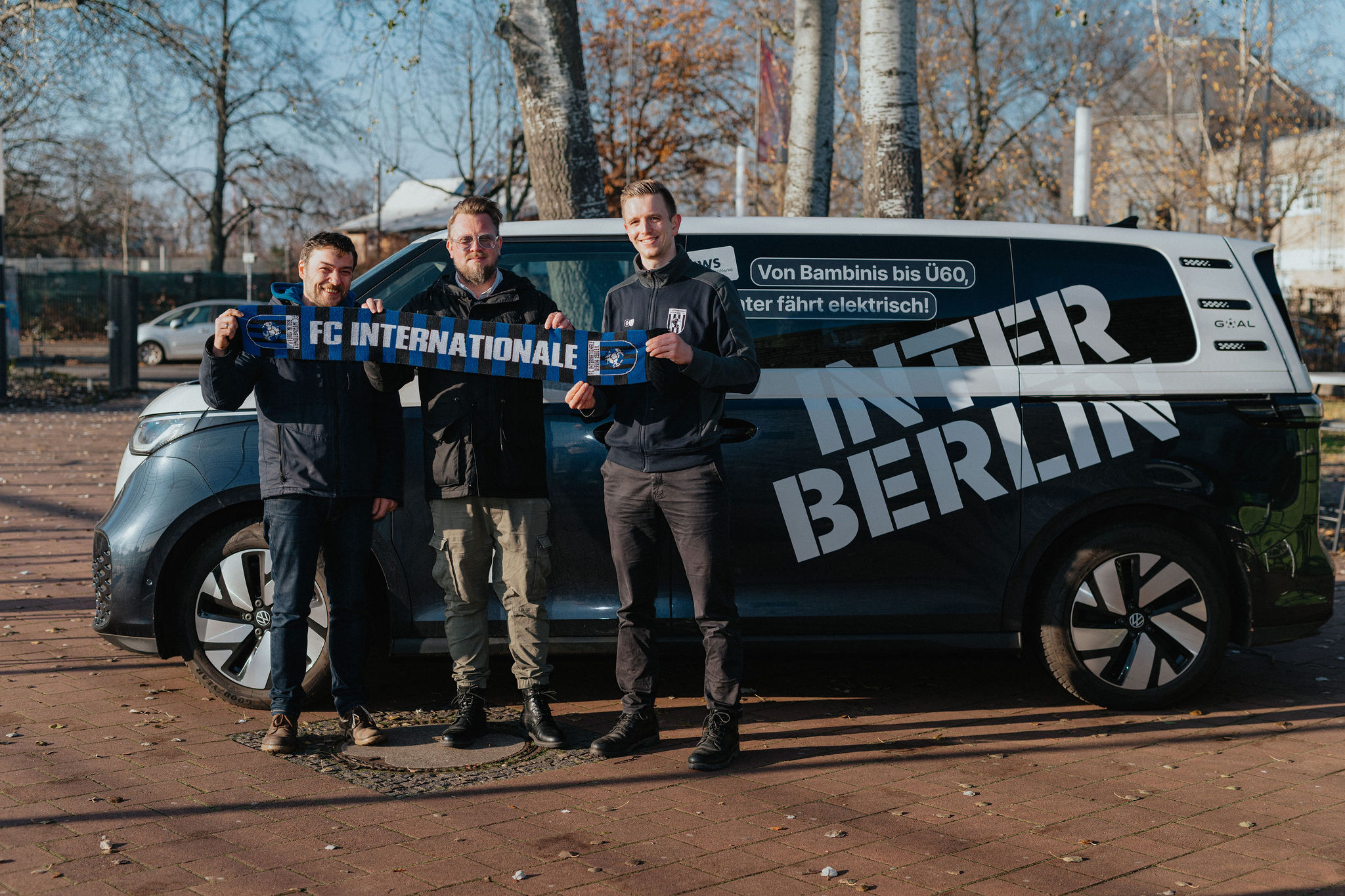 V.l.n.r.: Sebastian Sladek (Vorstandsmitglied der EWS), Ben Kandler (Geschäftsführung Sport, FC Internationale Berlin), Anton Klischewski (Vorstand/Koordinator für Nachhaltigkeit und Engagement, FC Internationale Berlin). Foto: Irnis Kubat